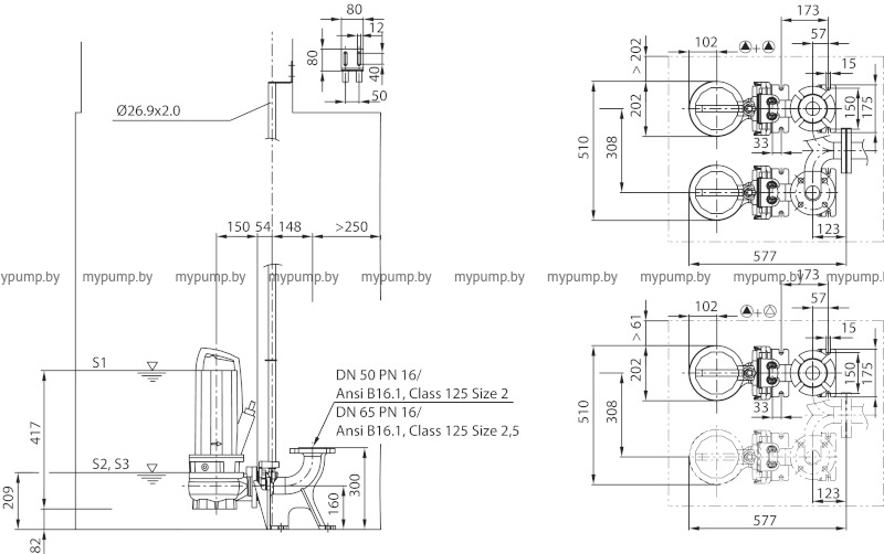 Погружной насос для отвода сточных вод для режима непрерывной эксплуатации, полностью из серого чугуна, для стационарной и мобильной установки в погруженном и непогруженном состоянии.